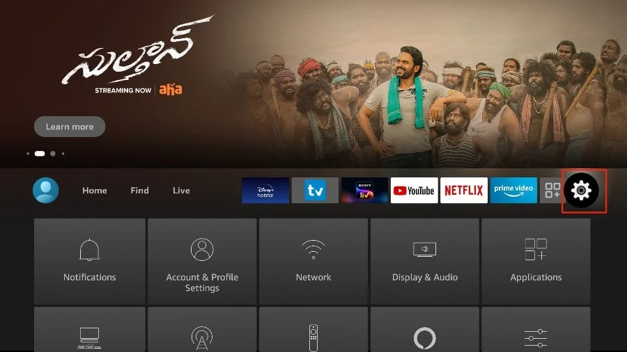 6. Open the FireStick home, scroll to the Settings icon, and select it.