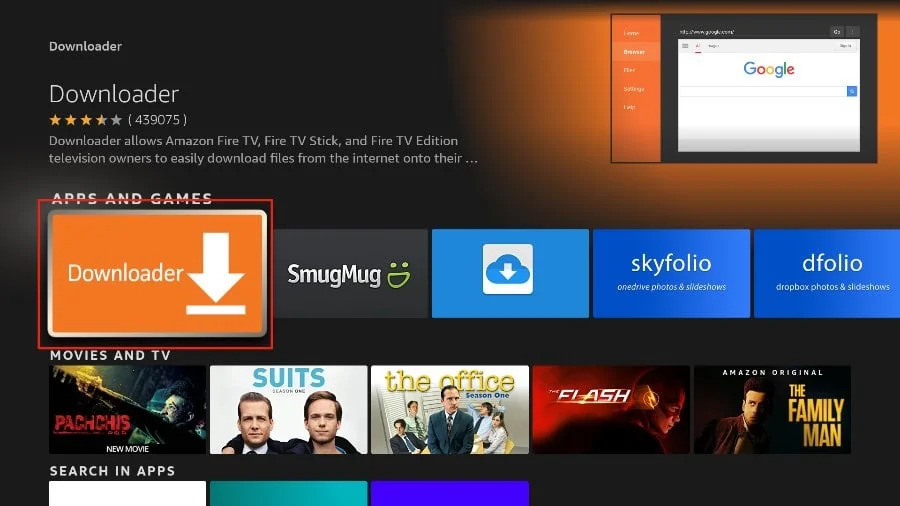 4. Select the Downloader app with the orange background in the APPS AND GAMES category.