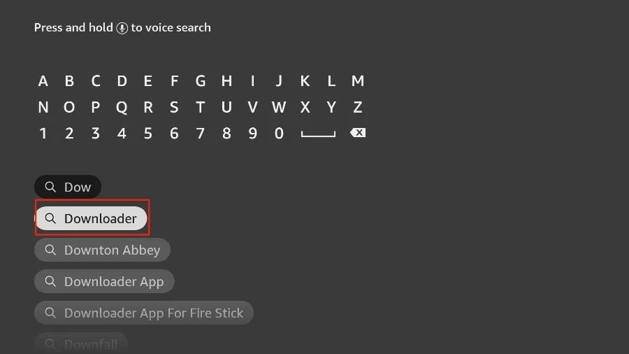 3. Search will take you to a virtual keyboard on FireStick. Type Downloader, and choose it from the suggestions below the keyboard.